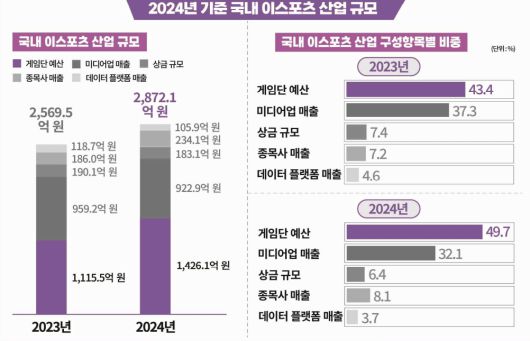 세부항목별로는 게임단 예산이 약 1426억원으로 전체 산업 규모의 49.7%에 달했다. 게임단 예산은 지난 2023년(약 1111억원) 처음으로 1000억원을 돌파한 이듬해에도 약 300억원 이상 증가한 것으로 나타났다.