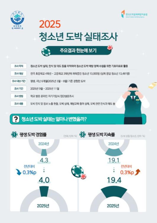 이번 실태조사는 국내 청소년들의 도박 경험률 등 도박행동 및 관련 인식을 파악하고, 청소년 도박 예방 정책 수립의 기초자료 확보를 위해 진행됐다. 국가데이터처의 국가통계승인을 받은 조사이며, 전국 633개교 초(4~6학년)·중·고 재학 청소년 1만 3481명을 대상으로 진행됐다.