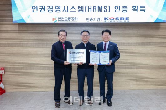 [이데일리 김태형 기자] 엄진엽(오른쪽부터) 중소벤처기업인증원장, 인천교통공사 최정규 사장, 신영은 상임감사가 30일 인천교통공사 대회의실에서 열린 '인권경영시스템(HRMS) 인증' 수여식에서 기념촬영을 하고 있다.