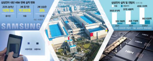 생산 능력 확충에도 속도를 낸다. HBM4 핵심인 10㎚(나노미터·10억분의 1m)급 6세대(D1c) D램 생산 기지인 평택캠퍼스 4공장 4구역 준공을 내년 1분기로 앞당긴다. 애초 2027년 1분기 예정이었다. 낸드와 D램 혼용 생산을 계획했던 4공장 2구역도 6세대 D램 전용 라인으로 구축하기로 확정했다. 폭증하는 수요에 선제 대응하겠다는 의지다. 실적 퀀텀 점프도 앞두고 있다. 증권가는 삼성전자의 2026년 영업이익이 올해보다 2배 이상 늘어난 100조 원 안팎을 기록할 것으로 본다. 예상 매출은 약 420조 원이다. 올해보다 80조 원가량 늘어난 규모다. 업계의 한 관계자는 “HBM3E로 신뢰를 회복한 삼성전자가 HBM4에서 기술적 초격차를 증명했다”며 “파운드리와 메모리를 턴키로 제공하는 삼성만의 솔루션이 내년 빅테크들의 수요와 맞물려 폭발적 시너지를 낼 것”이라고 말했다.
