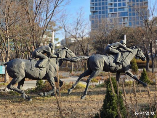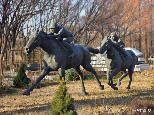 이번엔 발길을 서울숲으로 옮겨본다. 기수들이 말을 타고 질주하는 군마상이 관람객을 맞이한다. 살아 있는 말이 뛰는 듯 생생한 조각상이다. 뚝섬에서 말이 달렸던 것은 조선시대 뿐 아니다. 1954년부터 1989년까지 뚝섬에 경마장이 있었다.