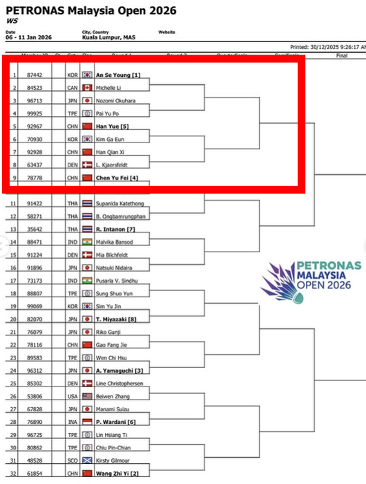 30일 발표된 세계배드민턴연맹(BWF) 월드투어 말레이시아 오픈(슈퍼 1000) 대진표에 따르면 안세영은 32강전부터 쉽지 않은 상대와 만난다.