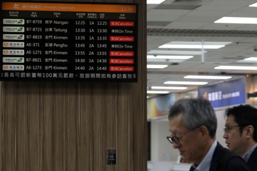 30일 타이베이의 쑹산 공항의 안내판에 중국의 대만 포위 군사 훈련 영향으로 많은 항공편이 결항했다. AP=연합뉴스 |