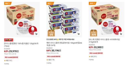 판매 1위에 오른 ‘100% 통곡물밥’(130g) 36개입은 정가 8만1000원에서 63% 할인된 2만9970원에 판매되고 있다. 정 대표 얼굴이 그려진 박스에 담긴 ‘렌틸콩현미밥’(190g) 24개입 역시 정가 8만3880원에서 64% 할인된 3만196원에 판매 중이다.
