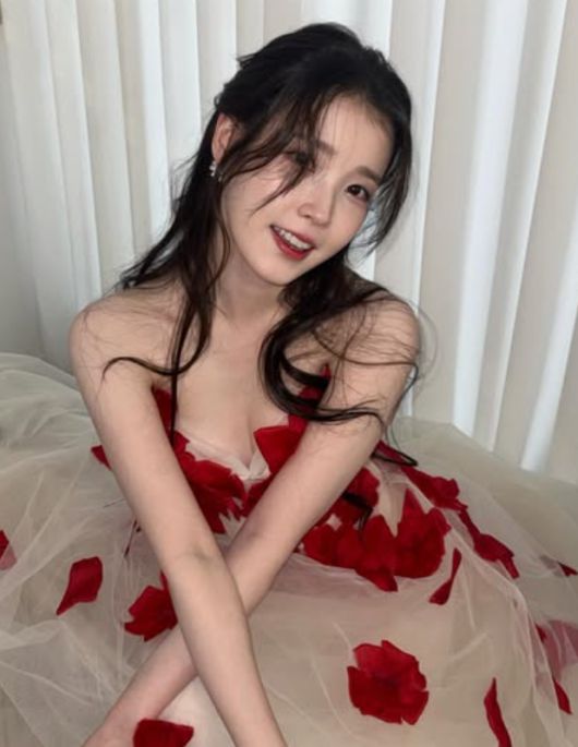 공개된 사진 속 아이유는 화이트 톤의 드레스에 붉은 꽃무늬가 더해진 의상을 입고 다양한 포즈를 취하고 있다. 정면은 물론 위에서 아래로 내려다본 앵글까지 활용해 사슴 같은 눈망울과 우아한 분위기를 강조했다.