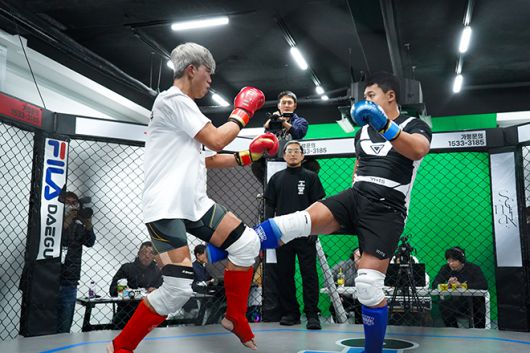 | 만재네와 산더미미성돼지국밥의 송민재 대표이사가 2025년 1월 뽀빠이연합의원KMMA26대구 메인이벤트에서 블랙컴뱃 언더그라운드 랭킹 6위 ‘뚝배기사범’ 이호철을 공격하고 있다. 사진=스탠다드앤드프로그레스 스포츠에이전시 |