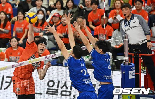 [OSEN=부산, 이석우 기자] 30일 부산 강서실내체육관에서 진에어 2025-2026 V리그 남자부 OK저축은행과 한국전력의 경기가 열렸다.