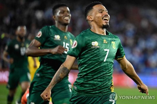 짐바브웨와 경기에서 결승 골을 터트린 남아공 오스윈 아폴리스의 세리머니 모습.연합뉴스 |