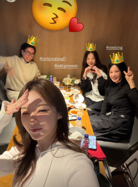 강민경은 고현정과 엄정화, 정재형 머리 위로 왕관 스티커를 붙이는가 하면, 뽀뽀를 날리는 이모티콘으로 우정을 과시했다.