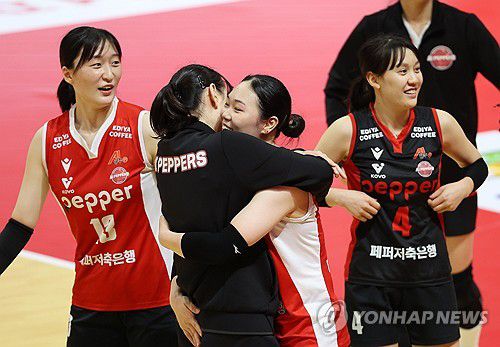 (광주=연합뉴스) 조남수 기자 = 30일 광주 서구 페퍼스타디움에서 열린 프로배구 V리그 여자부 페퍼저축은행과 GS칼텍스의 경기. 페퍼저축은행 선수들이 세트스코어 3-1 승리를 거두고 기뻐하고 있다. 2025.12.30
