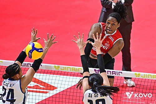 (서울=연합뉴스) 페퍼저축은행 외국인 선수 조이(오른쪽)가 30일 광주 페퍼스타디움에서 열린 프로배구 여자부 GS칼텍스와 홈 경기에서 공격을 시도하고 있다. 2025.12.30 [한국배구연맹 제공. 재판매 및 DB금지]