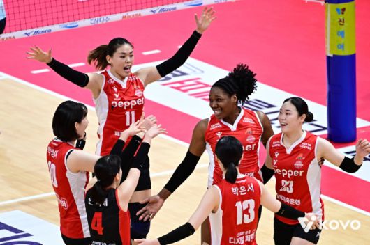 페퍼저축은행 선수들이 30일 광주 페퍼스타디움에서 열린 프로배구 V리그 여자부 홈 경기에서 GS칼텍스를 상대로 점수를 낸 뒤 기뻐하고 있다. 한국배구연맹 제공 |
