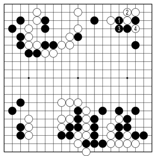 하변에서 대패한 리친청은 백1, 3으로 손을 돌린다. 여기서 신진서 9단은 흑4로 곱게 뻗었는데 이 수가 말하자면 두터운 수법이다. 귀의 AI 정석 중에서 가장 두터운 수법이라고 볼 수 있다.