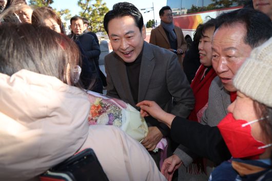 장동혁 국민의힘 대표가 30일 전북 김제시 새만금33센터 앞에서 지지자들과 인사를 나누고 있다./뉴스1 |
