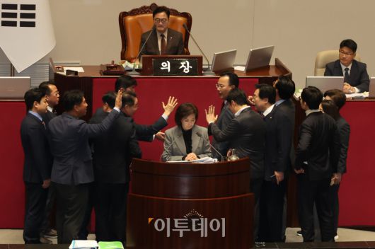 9일 서울 여의도 국회 본회의에서 나경원 국민의힘 의원이 '가맹사업거래의 공정화에 관한 법률 일부개정법률안'에 대한 무제한 토론(필리버스터)을 진행하는 중 우원식 국회의장, 여야 의원들이 충돌하고 있다. 우 의장은 나 의원이 의제와 관련없는 발언을 이어가자 발언을 중지시켰다. 고이란 기자 photoeran |