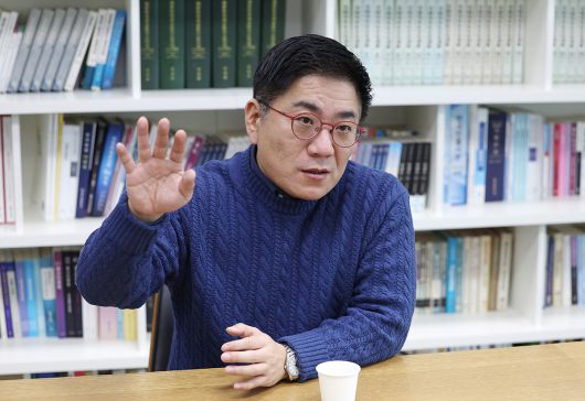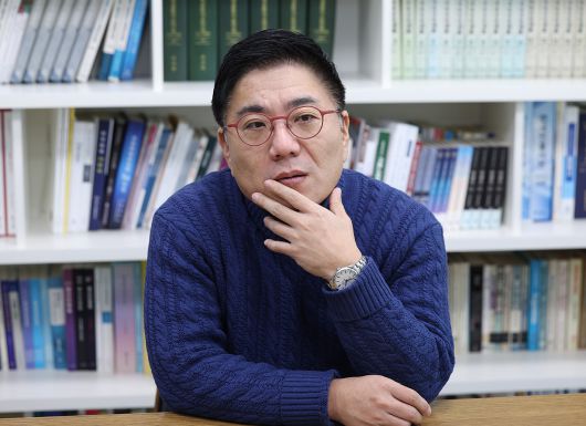 윤태곤 더모아 정치분석실장이 지난 24일 인터뷰에서 “더불어민주당과 국민의힘이 모두 당원을 리드하는 정치가 아니라 당원 뒤에 숨는 정치를 하고 있다”고 지적하고 있다. 남정탁 기자 |
