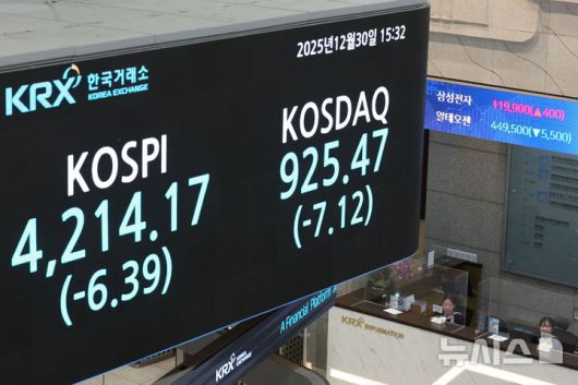 [서울=뉴시스] 권창회 기자 = 2025년 국내 증시 폐장일인 30일 오후 서울 영등포구 한국거래소 전광판에 증시 종가가 표시되고 있다. 2025.12.30. kch0523@newsis.com |