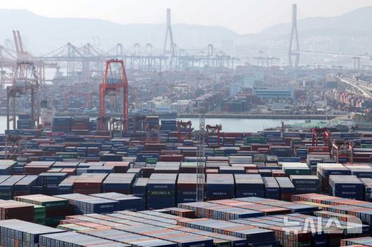 [부산=뉴시스] 하경민 기자 = 부산 남구 신선대(아래) 및 감만(위) 부두 야적장에 수출입 컨테이너가 쌓여 있다. 2025.12.29. yulnetphoto@newsis.com |