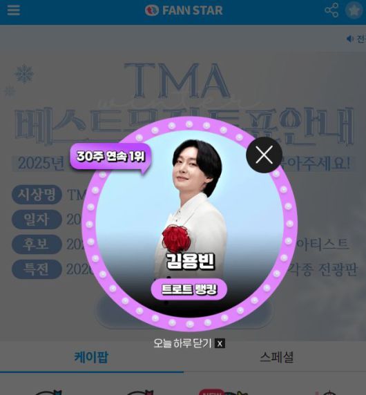 [더팩트 | 이나래 기자] 가수 김용빈이 주간 아이돌 랭킹사이트 '팬앤스타' 트로트 랭킹 30주 연속 1위에 올랐다.