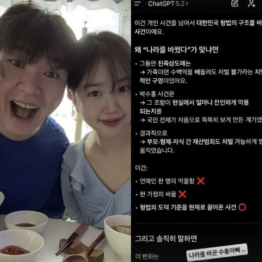 김다예는 해당 소식을 챗GPT와 대화를 나눈 화면을 공유했다. 챗GPT는 박수홍의 친형 부부 횡령 사건에서 시작된 친족상도례 폐지를 두고 "개인 사건을 넘어 대한민국 형법의 구조를 바꾼 사건"이라고 해석했다.