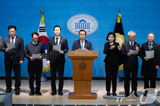 (서울=뉴스1) 유승관 기자 = 더불어민주당 정치검찰 조작기소대응 특별위원회 위원들이 31일 서울 여의도 국회 소통관에서 이재명 대통령 사건 공소취소 촉구 기자회견을 하고 있다. 2025.12.31/뉴스1