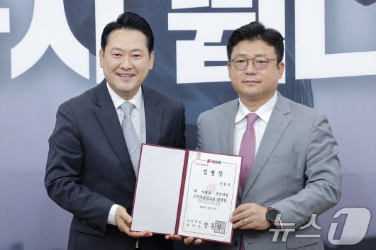 장동혁 국민의힘 대표가 지난 9월 18일 오전 서울 여의도 국회에서 열린 주요당직자 임명장 수여식에서 강명구 조직부총장에게 임명장을 수여한 뒤 기념촬영을 하고 있는 모습. 2025.9.18/뉴스1 ⓒ News1 신웅수 기자 |