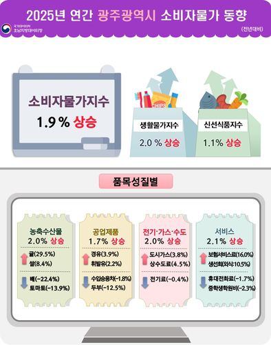 31일 국가데이터처 호남지방데이터청이 발표한 연간 광주·전남 소비자물가 동향에 따르면 광주의 소비자물가지수는 116.79(2020년=100)로 지난해보다 1.9% 상승했다.