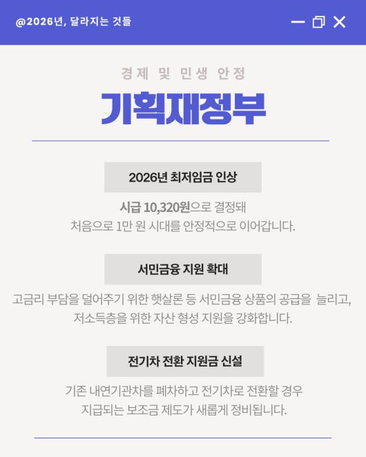 • 2026년 최저임금 인상: 시급 10320원으로 결정되어 처음으로 1만 원 시대를 안정적으로 이어갑니다.