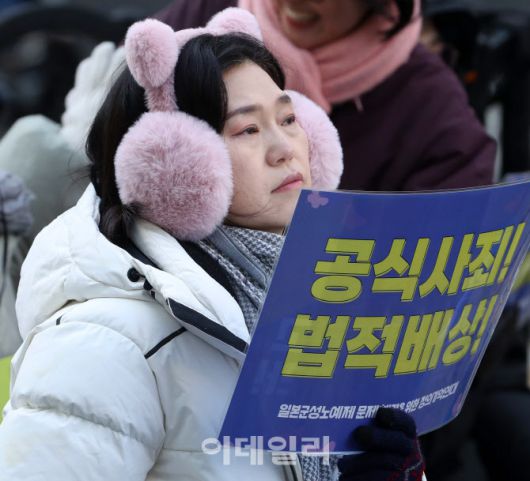 [이데일리 김태형 기자] 31일 서울 종로구 주한일본대사관 인근에서 열린 제1733차 '일본군성노예제 문제해결을 위한 정기 수요시위' 참가자가 공식사죄 등의 문구가 적힌 팻말을 들고 집회에 참가하고 있다.