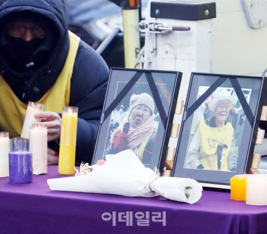 [이데일리 김태형 기자] 31일 서울 종로구 주한일본대사관 인근에서 열린 제1733차 일본군성노예제 문제해결을 위한 정기 수요시위에서 참가자들이 길원옥·이옥석 할머니 영정 앞에서 추모하고 있다.