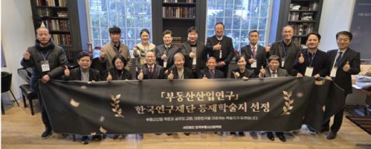 한국부동산산업학회 회원들이 지난 26일 서울 강남구 북쌔즈에서 열린 '이승한 논문상' 시상식 및 학회 학술지 '부동산산업연구'의 한국학술정보 등재학술지 선정을 기념하는 행사에서 기념촬영을 하고 있다./한국부동산산업학회 |
