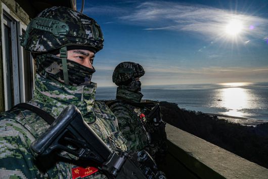 지난 22일 서해 최전방 말도에서 해병대 장병들이 해안경계작전 간 전방을 주시하고 있다. 뉴스1 |