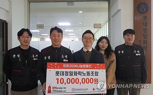 (울산=연합뉴스) 31일 롯데정밀화학 노동조합이 울산사회복지공동모금회에 성금 1천만원을 기탁했다. 성금은 롯데정밀화학 조합원들이 십시일반 마음을 모아 마련한 것으로, 저소득층과 사회복지시설 지원을 위해 사용된다. 2025.12.31 [울산사회복지공동모금회 제공.재판매 및 DB 금지]