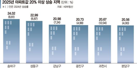 31일 KB부동산 월간 아파트값 통계를 분석한 결과 2025년 1~12월 서울 아파트값은 11.26% 올랐다. 지난 2024년 상승률(2.84%)과 비교하면 4배가량 뛴 것이다. 지역별로 보면 서울에서 아파트 매매가격이 20% 이상 급등한 지역이 다수 등장했다. 2025년 연간 통계를 보면 송파구가 24.02% 올라 전국 상승률 1위를 기록했다. 이어 성동구 22.99%, 강남구 20.98%, 광진구 20.73% 등 4곳의 아파트값이 20% 벽을 돌파한 것이다.