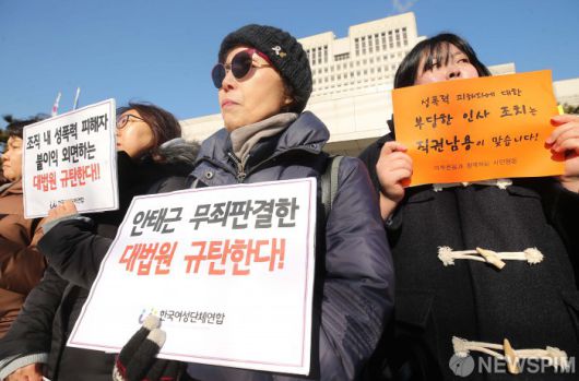 사진은 미투운동과 함께하는 시민행동 회원들이20년 1월 13일 오전 서울 서초동 대법원 앞에서 안태근 무죄판결한 대법원 규탄 기자회견을 열고 피켓을 들고 있다.[사진=뉴스핌DB] |