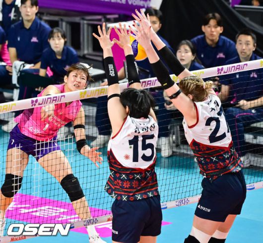 [OSEN=삼산체(인천), 박준형 기자] 31일 오후 인천 삼산체육관에서 프로배구 진에어 2025~26 V리그 흥국생명과 현대건설의 경기가 진행됐다. 흥국생명은 9승 9패 승점 29점으로 3위를, 현대건설은 12승 6패 승점 36점으로 2위를 차지하고 있다. 2세트 현대건설 카리가 블로킹 성공하고 있다. 2025.12.31 / soul1014@osen.co.kr