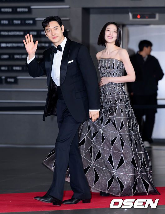 [OSEN=이대선 기자] 31일 오후 서울 마포구 SBS프리즘타워에서 ‘2025 SBS 연기대상’ 레드카펫 행사가 열렸다. ‘2025 SBS 연기대상’은 장르를 초월한 연기 신들의 각축전이 예고된 가운데, 고현정, 한지민, 윤계상, 이제훈, 박형식이 대상 후보로 이름을 올렸다. 배우 이제훈, 표예진이 포토타임을 가지고 있다. 2025.12.31 /sunday@osen.co.kr
