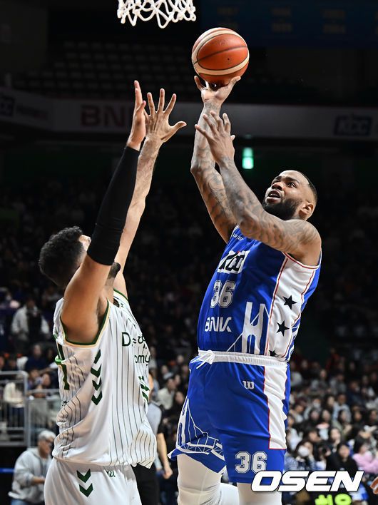 [OSEN=부산, 이석우 기자] 31일 부산 사직체육관에서 2025-2026 LG전자 프로농구 부산 KCC와 원주 DB의 경기가 열렸다. 2025년 마지막 경기가 8번째 농구영신으로 열렸다. 부산 KCC 숀롱이 원주 DB 에삼 무스타파의 마크를 피해 골밑슛을 시도하고 있다. 2025.12.31 / foto0307@osen.co.kr