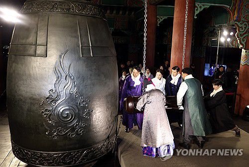 (서울=연합뉴스) 서명곤 기자 = 2026년 새해 첫날인 1일 서울 종로구 보신각에서 열린 제야의 종 타종행사에서 오세훈 서울시장, 가수 양희은, 가수 션, 육상선수 나마디 조엘진 등 시민대표들이 타종을 하고 있다. 2026.1.1
