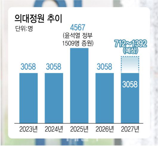 이를 2027년부터 2034년까지 균등하게 배분할 경우 매년 의대 정원은 1392명씩 늘어나게 된다. 같은 방식으로 2040년 최소 부족 인원으로 추산된 5704명을 충원할 경우 연간 증원 규모는 약 713명 수준이다.