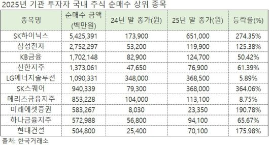 기관은 삼성전자와 SK하이닉스를 모두 담아 눈길을 끈다. 기관의 지난해 순매수 1위와 2위는 각각 SK하이닉스와 삼성전자였으며, 순매수 규모는 SK하이닉스(5조4250억 원)가 삼성전자(2조7520억 원)의 2배에 달했다. 뒤이어 KB금융(1조7020억 원), 신한지주(1조3730억 원) 등 금융주가 순매수 상위 종목에 이름을 올렸다.