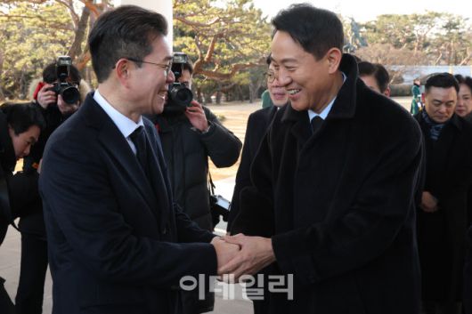 [이데일리 이영훈 기자] 오세훈 서울시장(오른쪽)과 정원오 성동구청장이 새해 첫날인 1일 서울 동작구 국립서울현충원에서 현충탑에 참배를 마친 뒤 인사하고 있다.