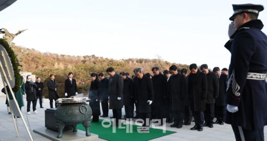 [이데일리 이영훈 기자] 우원식 국회의장과 의원들이 새해 첫날인 1일 서울 동작구 국립서울현충원에서 현충탑에 참배하고 있다.