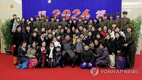 (서울=연합뉴스) 김정은 북한 국무위원장이 1일 2026년 신년경축행사에 참가한 러시아 파병 '해외작전부대' 지휘관 가족들을 만나 기념사진을 찍었다고 조선중앙TV가 1일 보도했다. [조선중앙TV 화면] 2026.1.1