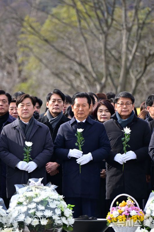 [김해=뉴시스] 차용현 기자 = 1일 오후 더불어민주당 정청래 대표와 당 지도부가 경남 김해시 봉하마을 고 노무현 전 대통령 묘역을 찾아 참배를 하고 있다. 2026.01.01. con@newsis.com |