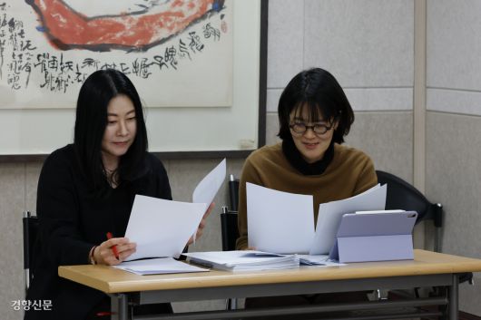 양윤의(왼쪽)·차미령 평론가가 2026 경향신문 신춘문예 평론 본심 심사를 하고 있다. 문재원 기자 |