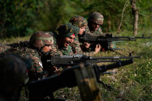 [아크누르=AP/뉴시스] 16일(현지 시간) 인도 잠무 북서쪽 약 66㎞ 떨어진 아크누르 지역에서 인도 군인들이 인도와 파키스탄을 가르는 실질통제선(LoC) 일대에서 순찰 및 전술 훈련을 하고 있다. 2025.10.17 |