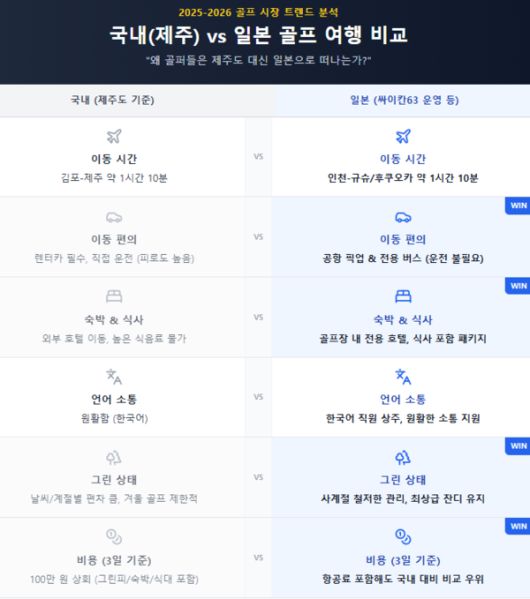 최근 캄보디아 등 일부 동남아 국가에서 발생한 범죄 단체 연루 사건들과 불안한 치안 문제는 골퍼들에게 큰 심리적 장벽으로 작용하고 있다. 반면, 일본은 '치안이 안전하다'는 인식이 확고하고, 거리상으로도 가장 가깝다는 지리적 이점을 가지고 있다. 엔저 현상의 지속 여부와 상관없이, 깨끗한 시설과 정갈한 음식, 그리고 무엇보다 안전이 보장된 일본 골프장으로의 쏠림 현상은 당분간 지속될 것으로 분석된다.