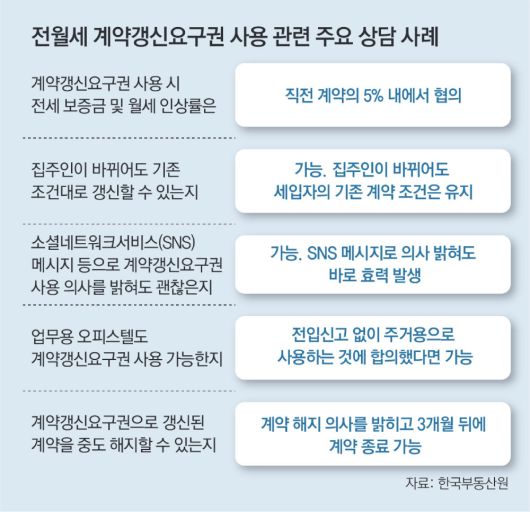 Q. 세입자가 재계약을 하면서 계약갱신요구권을 사용한다고 합니다. 갱신권 행사 시 전월세 가격을 5% 이내에서 인상할 수 있다고 하는데 집주인 또는 세입자가 요구하는 수준에 맞춰야 하는 건가요?