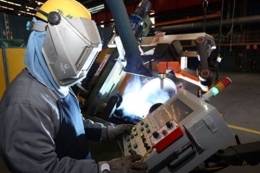 경남 거제시 한화오션 조선소에서 용접공이 배관 용접용 협동로봇을 활용해 작업하고 있다. 한화오션 |
